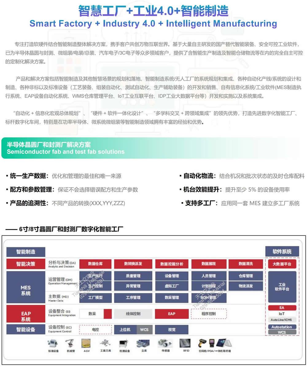 專注打造軟硬件結(jié)合智能制造整體解決方案,攜手客戶共創(chuàng)萬物互聯(lián)世界?;诖罅孔灾餮邪l(fā)的國產(chǎn)替代智能裝備、安全可控工業(yè)軟件,已為半導(dǎo)體晶圓與封測、微組裝/電裝/總裝、汽車電子/3C電子等眾多領(lǐng)域客戶,提供了含智能生產(chǎn)制造及智能倉儲(chǔ)物流等在內(nèi)的完全自主可控的定制化解決方案。