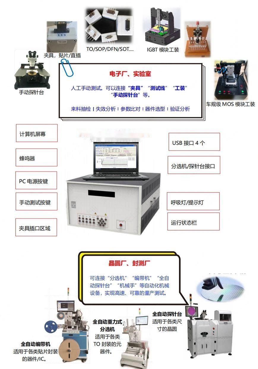 產(chǎn)品為桌面放置的臺式機(jī)結(jié)構(gòu),由測試主機(jī)和程控電腦兩大部分組成。外掛各類夾具和適配器,還能夠通過Prober 接口、Handler 接口可選(16Bin)連接分選機(jī)和機(jī)械手建立工作站,實現(xiàn)快速批量化測試。通過軟件設(shè)置可依照被測器件的參數(shù)等級進(jìn)行自動分類存放。能夠極好的應(yīng)對“來料檢驗”“失效分析”“選型配對”“量產(chǎn)測試”等不同場景。