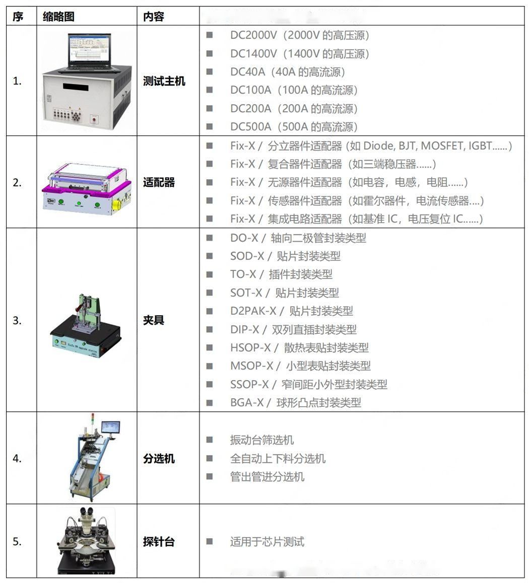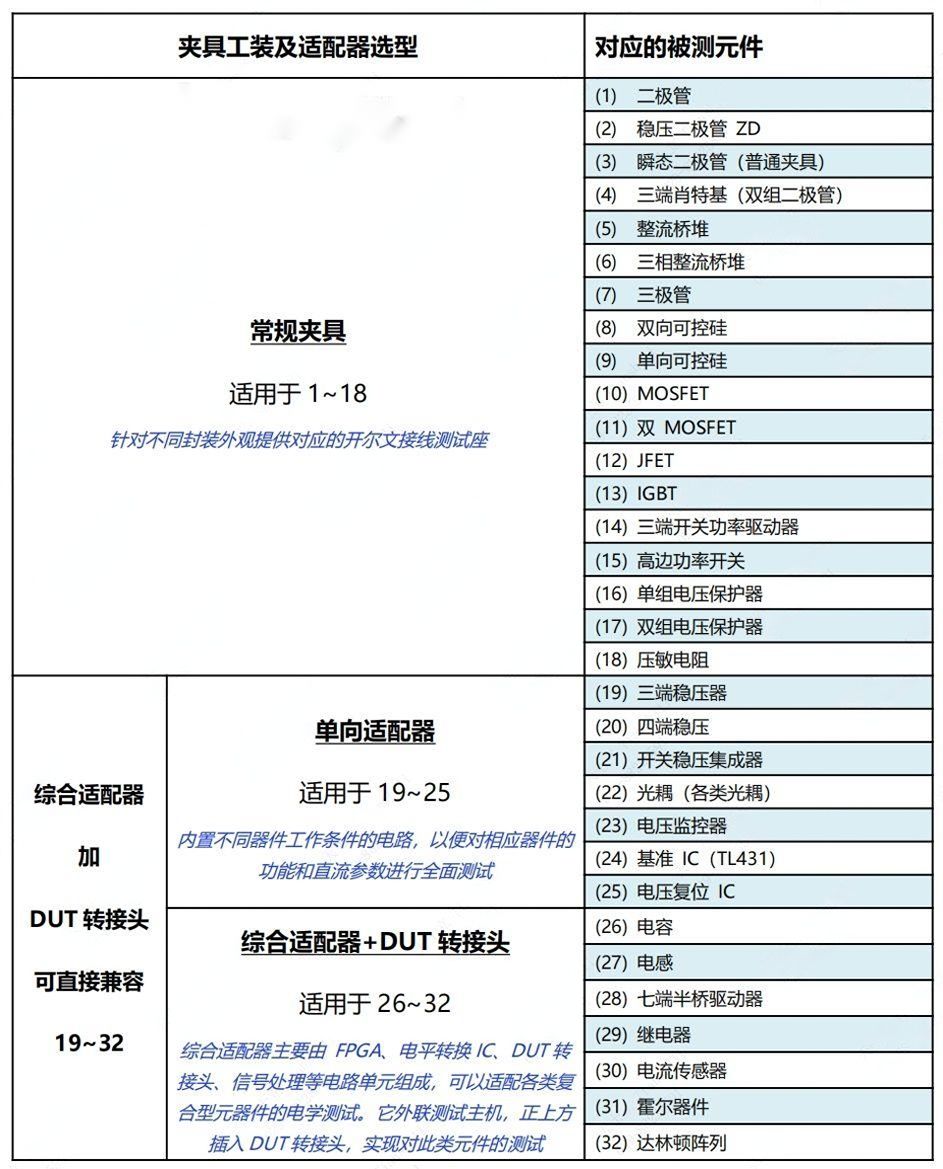 測試種類覆蓋 7 大類別26分類,包括“二極管類”“三極管類(如BJT、MOSFET、IGBT)”